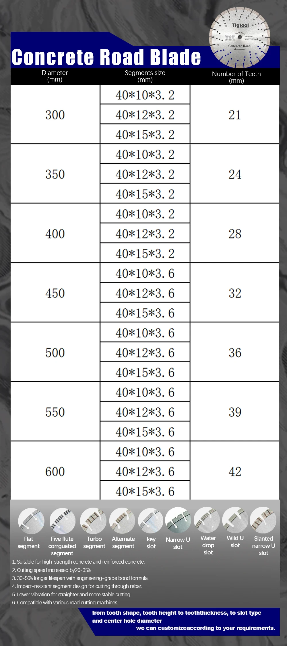 High diamond concentration + tungsten carbide for 30-50% longer lifespan.