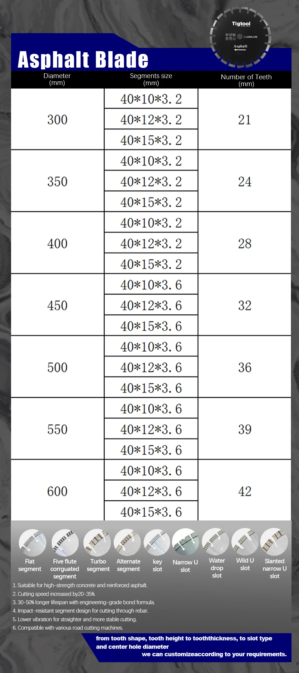 Premium wear resistance with only 10mm segment height, excellent cost-performance, proven in U.S. and Japan markets.
